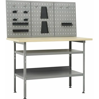 VidaXLThis set is combined with 1 workbench and 3 wall panels, and make a practical storage solution to your workshop and garage. The heavy-duty workbench, standing out with ample storage space and 300 kg loading capacity. This workbench has 2 large shelves, to easily accommodate drills, cable drums, grinders and other tools. Additionally, the feet are height-adjustable. This workstation is crafted from premium steel and engineered wood, making it extra sturdy, durable and easy to clean. It is easy to assemble. These tool panels are crafted from solid steel to bear the weight of various tools, like drills, pliers, screwdrivers and wrenches. These panels are perforated for fixing tools easily and securely. The 3 wall panels can be fixed together for extra rigidity. It is an ideal addition to your workbench and workshop cabinets with a practical width of 120 cm.