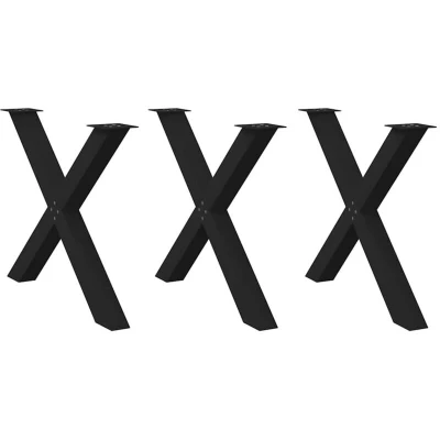 ManoManoGeneral description These dining table legs combine form and function, making them an ideal choice for customizing your dining table. The X-shaped design not only adds a modern aesthetic but also ensures stability and support for a heavy tabletop. Technical specifications Colour: Black Material: Powder-coated steel Overall size: 90 x (72-73) cm (W x H) Bracket dimensions: 140 x 140 x 4 mm (L x W x T) Tube dimensions: 80 x 80 x 1.2 mm (L x W x T) With adjustable plastic levelers Assembly required: Yes Delivery contains: 3 x Dining table leg, Screws (M5x18mm) for fixing legs with tabletop Installation The metal table legs come with pre-drilled holes and include screws for easy assembly to the tabletop (not included). Usage These legs are recommended for use with dining tables and desks, providing a sturdy and stylish support. Other information