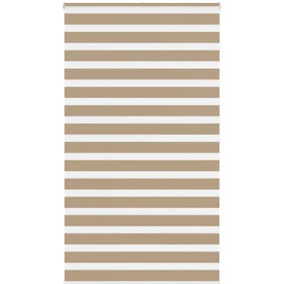 ManoManoGeneral description Elevate your room's style and functionality with this zebra blind, offering privacy and elegance. Made from 100% polyester, the zebra blind is durable, low maintenance, and easy to clean, typically requiring light dusting or wiping with a damp cloth. The two-layer design features alternating transparent and opaque fabric panels, allowing for seamless adjustment of the room's lighting from translucent to fully darkened. Technical specifications Colour: Sand brown Material: 100% polyester Top rail material: Aluminium Total height: 200 cm Total width: 125 cm Fabric width: 120.9 cm (tolerance ± 4 mm) Opaque strips height: 7.5 cm Transparent strips height: 5 cm Window frame thickness range: 0.5-2.5 cm Assembly required: Yes Compatibility and accessories Two assembly methods: with screws or without drilling using clamping brackets Mounting accessories included Chain connector for height adjustment Usage The zebra blind can be used in various settings, including the