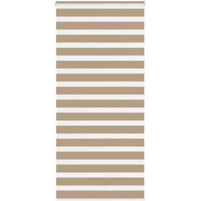ManoManoGeneral description Elevate your room's style and functionality with this zebra blind, offering privacy and elegance. Made from 100% polyester, the zebra blind is built to last and resist wear and tear. The two-layer design features alternating transparent and opaque fabric panels, allowing for easy control of light in your space. Technical specifications Colour: Sand brown Material: 100% polyester Top rail material: Aluminium Total height: 200 cm Total width: 95 cm Fabric width: 90.9 cm (tolerance ± 4 mm) Opaque strips height: 7.5 cm Transparent strips height: 5 cm Window frame thickness range: 0.5-2.5 cm Assembly required: Yes Compatibility and accessories Mounting accessories included Two assembly methods: with screws or without drilling using clamping brackets Installation You can attach the zebra roller blind to the wall or window depending on your needs. Assembly is required, and all necessary mounting accessories are included. Usage The light can be easily controlled using the