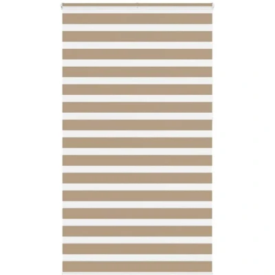 ManoManoGeneral description Elevate your room's style and functionality with this zebra blind, offering privacy and elegance. Made from 100% polyester, the zebra blind is durable and low maintenance, built to resist wear and tear. The two-layer design features alternating transparent and opaque fabric panels, allowing for easy control of light in your space. Technical specifications Colour: Sand brown Material: 100% polyester Top rail material: Aluminium Total height: 230 cm Total width: 130 cm Fabric width: 125.9 cm (tolerance ± 4 mm) Opaque strips height: 7.5 cm Transparent strips height: 5 cm Window frame thickness range: 0.5-2.5 cm Assembly required: Yes Compatibility and accessories Mounting accessories included Two assembly methods: with screws or without drilling using clamping brackets Installation You can attach the zebra roller blind to the wall or window based on your preference. Assembly is required, and all necessary mounting accessories are included. Usage The zebra blind is