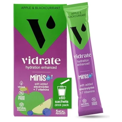 Vidrate Electrolytes Powder Minis Hydration Sachets with Vitamins & For Kids Zero Sugar No Artificial Sweeteners Preservatives Apple Blackcurrant, 60