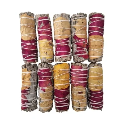 VIE Smudge Stick, White Sage, Red and Yellow Rose Petals 4", Pack of 10