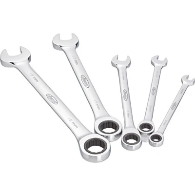 Set Contents 5 Pieces Of Ratcheting Combination Wrench, Long Style With The Size Of 8 · 10 · 13 · 17 · 19 mm Ratchet Ring Made Of Polished Chrome-Plated Chromium Vanadium Steel Designed And Tested To Reach Studs In Difficult Work Areas Ratchet Ring Spanner Set, Long Version With Roll-Up Bag