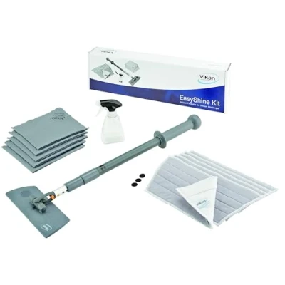EASYSHINE KIT - Microfibre cleaning solution for any smooth surface PERSPEX - Perfect solution for cleaning perspex screens CLEAN ANY SURFACE - Complete solution for cleaning windows, mirrors, tiles, stainless steel, white boards and other high gloss surfaces using just tap water CURVED MOP FRAME - Surfaces such as such as revolving doors, bathtubs, jacuzzies, curved plastic seats and vehicle windows can also be cleaned easily REACH UP TO 3 METRES - Kit contains telescopic handle extends up to 1400mm enabling reach up to 3 metres depending on user height
