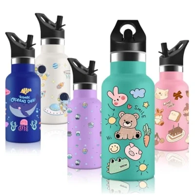 Water bottle with two straws: with a straw lid, you can drink easily and leak-proof. Easily drink water from the bottle without removing the cap. The sports thermos cup features a handle on the lid for easy transport. With the removable lid, you can choose how you want to drink for a super cool, enjoyable drinking experience Double-wall insulation technology: thermos flask is made of 18/8 stainless steel and is BPA-free. Stainless steel double wall vacuum insulation keeps water hot for up to 12 hours and cold for up to 31 hours. Whether in summer or winter, you can enjoy a satisfactory temperature Healthy materials: drinking bottle with straw made of food-safe stainless steel and is odourless. At the same time, the anti-slip design ensures a comfortable and secure hold. And the powder coating will not fade, peel or crack over time. The use of this practical water bottle not only protects nature sustainably, but also saves daily costs Leak-proof lid: the lid is filled with food-safe silicone to ensure that no water leaks. You can safely put the cup in your child's school or travel backpack and no longer have to worry about items getting wet! This 350 ml thermos bottle can be easily taken with you when travelling, whether you are walking or running, the thermos cup with handle is always by your side Interesting design: our bottle has a 3D print design. This cute thermos bottle is specially designed for children at school, home or outdoors and has interesting patterns: astronauts, underwater world, various small animals, etc. It is very suitable for children. Vikastar reusable water bottles are great gifts for Halloween and Christmas