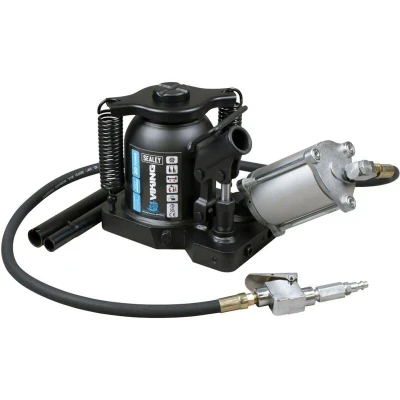 General description Sealey Viking Manual/Air Hydraulic Bottle Jack is a versatile tool capable of both air-assisted and manual operation, making it ideal for various lifting tasks. It features a robust design with an all-steel, one-piece extra thick base, reservoir, and pump cylinder, ensuring durability and strength under load. The jack is equipped with a safety overload valve for added security during use. Technical specifications Model No.: AM20SLE Min. Height: 185 mm Max. Height: 325 mm Operation: Air assisted or manual Construction: All steel, one-piece base, reservoir, and pump cylinder Handle: 2-piece pump handle Pump: 90° rotating pump Ram piston: Fully serviceable with extension screw Guarantee: 3 Year Guarantee* Compatibility and accessories Service kit readily available Usage Ideal for low profile vehicles, including buses and coaches Convenient for use when an air supply is unavailable