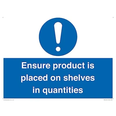 M001 : General mandatory action This sign is made from plastic semi-rigid 1mm Comes with4mm Corner Holes. 1mm thin plastic sign, can be screwed, stuck with adhesive, or attached with cable ties. Not suitable for hanging. A3 landscape Sign Text: Ensure product is placed on shelves in quantities