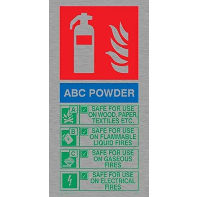ABC Powder fire extinguisher sign instructions for use Complies with EN 7010 Safety Sign Requirements Premium finish, tough and durable to suit a modern, stylish environment. Marine Grade Stainless Steel Viking Signs brand Safety Signs are manufactured in the UK and used everywhere from Giraffe Restaurants to the Excel Centre in London.