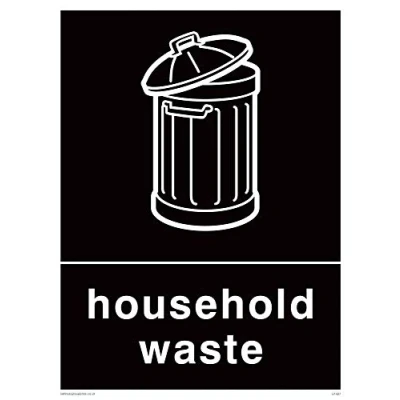 Black background with white household waste symbol and text Standardised finish for a whole range of door, room and information signs. A very, very tough and durable finish. This road-sign like material is suitable for outdoor applications where durability is needed. It can be screw or post mounted. Aluminium Composite Viking Signs brand Safety Signs are manufactured in the UK and used everywhere from Giraffe Restaurants to the Excel Centre in London.