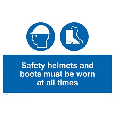 Hard hat and Safety boots symbols Complies with EN 7010 Safety Sign Requirements Sticker with a white background colour, comes with a self-adhesive backing. Suitable for fixing to clean, flat, solid surfaces. Vinyl Viking Signs brand Safety Signs are manufactured in the UK and used everywhere from Giraffe Restaurants to the Excel Centre in London.