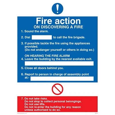 Fire Action Sign with exclamation and prohibited symbols Standardised finish for a whole range of door, room and information signs. A very, very tough and durable finish. This road-sign like material is suitable for outdoor applications where durability is needed. It can be screw or post mounted. Aluminium Composite Viking Signs brand Safety Signs are manufactured in the UK and used everywhere from Giraffe Restaurants to the Excel Centre in London.
