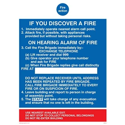 Fire action Standardised finish for a whole range of door, room and information signs. Sticker with a white background colour, comes with a self-adhesive backing. Suitable for fixing to clean, flat, solid surfaces. Vinyl Viking Signs brand Safety Signs are manufactured in the UK and used everywhere from Giraffe Restaurants to the Excel Centre in London.