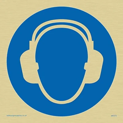 ear protection symbol Standardised finish for a whole range of door, room and information signs. Semi-flexible plastic with metallic effect for a traditional brass look, comes with self-adhesive backing. Rigid Gold Plastic Viking Signs brand Safety Signs are manufactured in the UK and used everywhere from Giraffe Restaurants to the Excel Centre in London.