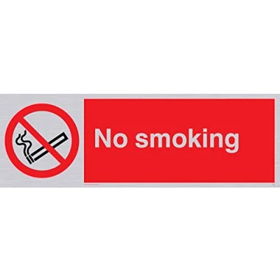 No smoking symbol - cigarette & smoke in black with red prohibition circle & line through, white text on red background Complies with EN 7010 Safety Sign Requirements Metallic effect thin film sticker, for a contemporary look, comes with self-adhesive backing Silver Vinyl Viking Signs brand Safety Signs are manufactured in the UK and used everywhere from Giraffe Restaurants to the Excel Centre in London