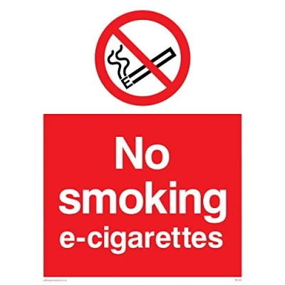 Prohibition > no smoking e-cigarettes safety sign. no smoking symbol - cigarette & smoke in black with red prohibition circle & line through, white text on red background Complies with EN 7010 Safety Sign Requirements Sticker with a white background colour, comes with a self-adhesive backing. Suitable for fixing to clean, flat, solid surfaces Vinyl Viking Signs brand Safety Signs are manufactured in the UK and used everywhere from Giraffe Restaurants to the Excel Centre in London