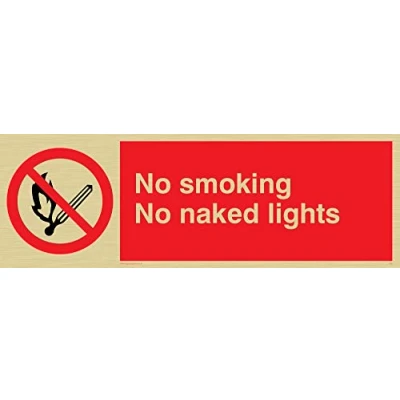 Prohibition > no smoking safety sign. no matches symbol - match in black with red prohibition circle & line through, white text on red background Complies with EN 7010 Safety Sign Requirements Semi-flexible plastic with metallic effect for a traditional brass look, comes with self-adhesive backing Rigid Gold Plastic Viking Signs brand Safety Signs are manufactured in the UK and used everywhere from Giraffe Restaurants to the Excel Centre in London