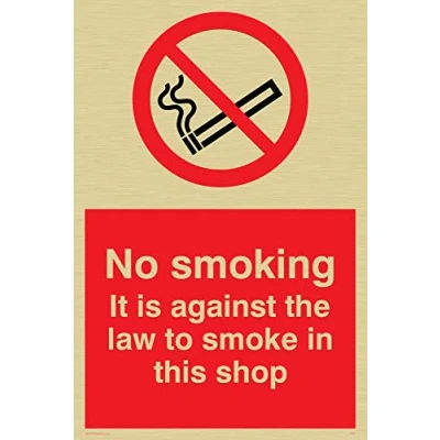 No smoking symbol & wording - to meet July 2007 smoking ban guidelines Complies with EN 7010 Safety Sign Requirements Metallic effect thin film sticker, for a traditional brass look, comes with self-adhesive backing Gold Vinyl Viking Signs brand Safety Signs are manufactured in the UK and used everywhere from Giraffe Restaurants to the Excel Centre in London