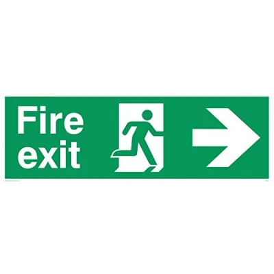 Fire exit sign with running man facing right & arrow right Complies with EN 7010 Safety Sign Requirements Sticker with a white background colour, comes with a self-adhesive backing. Suitable for fixing to clean, flat, solid surfaces Vinyl Viking Signs brand Safety Signs are manufactured in the UK and used everywhere from Giraffe Restaurants to the Excel Centre in London