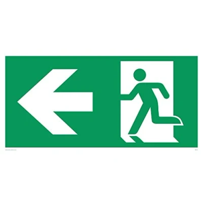 Fire exit/emergency exit sign with arrow left & running man facing left Complies with EN 7010 Safety Sign Requirements Sticker with a white background colour, comes with a self-adhesive backing. Suitable for fixing to clean, flat, solid surfaces Vinyl Viking Signs brand Safety Signs are manufactured in the UK and used everywhere from Giraffe Restaurants to the Excel Centre in London
