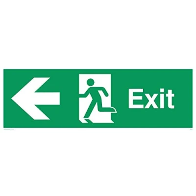 Fire exit/emergency exit sign with arrow to left & running man facing left Complies with EN 7010 Safety Sign Requirements Sticker with a white background colour, comes with a self-adhesive backing. Suitable for fixing to clean, flat, solid surfaces Vinyl Viking Signs brand Safety Signs are manufactured in the UK and used everywhere from Giraffe Restaurants to the Excel Centre in London