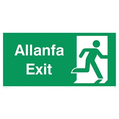 Bi-lingual-welsh/English with running man symbol facing right Complies with EN 7010 Safety Sign Requirements Sticker with a white background colour, comes with a self-adhesive backing. Suitable for fixing to clean, flat, solid surfaces Vinyl Viking Signs brand Safety Signs are manufactured in the UK and used everywhere from Giraffe Restaurants to the Excel Centre in London