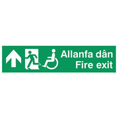 "bi-lingual-welsh/English with running man, disabled/wheelchair symbol facing left and arrow pointing up" Complies with EN 7010 Safety Sign Requirements Sticker with a white background colour, comes with a self-adhesive backing. Suitable for fixing to clean, flat, solid surfaces Vinyl Viking Signs brand Safety Signs are manufactured in the UK and used everywhere from Giraffe Restaurants to the Excel Centre in London