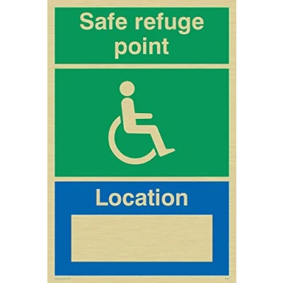 Safe refuge point Wheelchair/disabled symbol with location and space to write-sign Complies with EN 7010 Safety Sign Requirements Metallic effect thin film sticker, for a traditional brass look, comes with self-adhesive backing Gold Vinyl Viking Signs brand Safety Signs are manufactured in the UK and used everywhere from Giraffe Restaurants to the Excel Centre in London