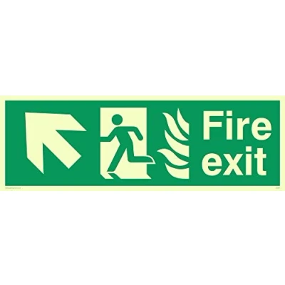 Fire exit / emergency exit sign with arrow diagonally up & left with running man facing left and flames symbol - safety sign Complies with EN 7010 Safety Sign Requirements Glow in the dark. Tough and flexible - suitable for indoor and outdoor applications, can be stuck with adhesive (not supplied) or easily drilled and fixed with screws Plastic Semi-rigid Photoluminescent Viking Signs brand Safety Signs are manufactured in the UK and used everywhere from Giraffe Restaurants to the Excel Centre in London