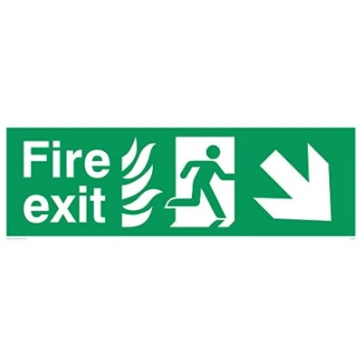 Fire exit / emergency exit sign with arrow diagonally down & right with running man facing right and flames symbol - safety sign Complies with EN 7010 Safety Sign Requirements Tough and flexible - suitable for indoor and outdoor applications, can be stuck with adhesive (not supplied) or easily drilled and fixed with screws Plastic Semi-Rigid 1mm Viking Signs brand Safety Signs are manufactured in the UK and used everywhere from Giraffe Restaurants to the Excel Centre in London