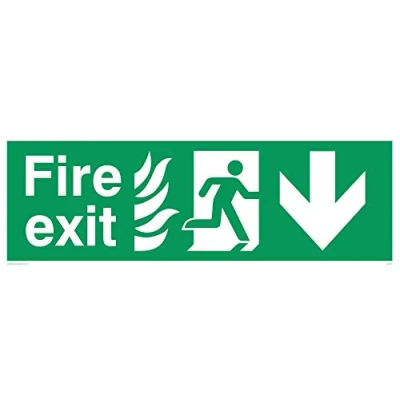 Fire exit / emergency exit sign with arrow down with running man facing right and flames symbol -sign Complies with EN 7010 Safety Sign Requirements A very, very tough and durable finish. This road-sign like material is suitable for outdoor applications where durability is needed. It can be screw or post mounted Aluminium Composite Viking Signs brand Safety Signs are manufactured in the UK and used everywhere from Giraffe Restaurants to the Excel Centre in London
