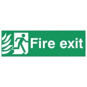 Fire exit / emergency exit sign with running man facing right with flames symbol - sign Complies with EN 7010 Safety Sign Requirements Sticker with a white background colour, comes with a self-adhesive backing. Suitable for fixing to clean, flat, solid surfaces Vinyl Viking Signs brand Safety Signs are manufactured in the UK and used everywhere from Giraffe Restaurants to the Excel Centre in London