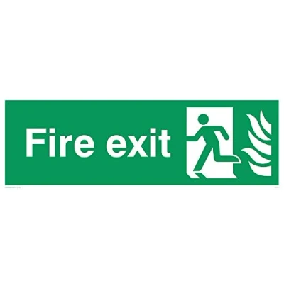 Fire exit / emergency exit sign with running man facing left with flames symbol - sign Complies with EN 7010 Safety Sign Requirements Tough and flexible - suitable for indoor and outdoor applications, can be stuck with adhesive (not supplied) or easily drilled and fixed with screws Plastic Semi-Rigid 1mm Viking Signs brand Safety Signs are manufactured in the UK and used everywhere from Giraffe Restaurants to the Excel Centre in London