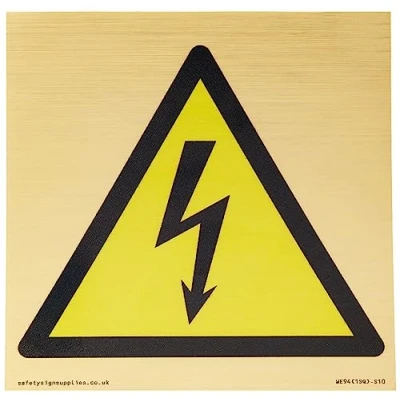 W012 : Electricity This sign is made from vinyl gold sticker Gold metal effect sticker for flat, clean surfaces. Not for rough, plastic, or dusty surfaces. S10 square Sign Text: None