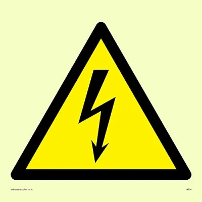 Electrical warning triangle Complies with EN 7010 Safety Sign Requirements Glow In The Dark sticker. Can be fixed onto any flat surface and will store ambient light and then glow if power is temporarily cut to lights or visibility is reduced Photoluminescent Sticker Viking Signs brand Safety Signs are manufactured in the UK and used everywhere from Giraffe Restaurants to the Excel Centre in London