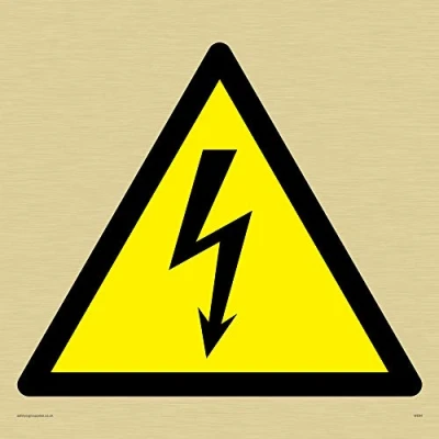 Electrical warning triangle Complies with EN 7010 Safety Sign Requirements Semi-flexible plastic with metallic effect for a traditional brass look, comes with self-adhesive backing Rigid Gold Plastic Viking Signs brand Safety Signs are manufactured in the UK and used everywhere from Giraffe Restaurants to the Excel Centre in London