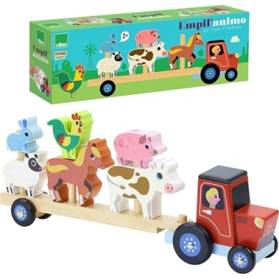 Vilac Truck and Tractor Farm Yard Animal Game, Stacking Wooden Vehicles, Montessori Play, 12 Months+