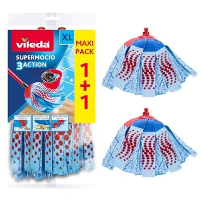 REMOVES OVER 99% OF BACTERIA WITH JUST WATER* - Whether it be dust, hair, liquid, crumbs or mud: Using the three-zones of the large microfibre mop, the Vileda SuperMocio 3Action XL refill removes over 99% of bacteria with just water. DEEP-CLEANING POWER ZONES - Three different power zones with unique cleaning powers allow an optimal deep cleaning of your sealed hard floors at home. The red non-scratch scourer tackles stubborn dirt, the blue microfibre zone removes grease, and the 3D red power dots pick up hair and dirt particles. REUSABLE AND MACHINE WASHABLE – Use a fresh and clean mop every time you want to clean your floors. Vileda SuperMocio 3Action is machine washable at up to 60 °C. Wash with similar textiles. The washable mop heads of this large mop can easily be cleaned in your washing machine without losing efficiency. LEMON SHAPED HEAD - The uniquely lemon-shaped Vileda mop head easily cleans hard-to-reach spots like corners and under furniture. This machine-washable mop head refill is compatible with all Vileda SuperMocio mop handles, allowing you to detach and reattach it to fit your cleaning style. HIGHLY ABSORBENT FIBRES - With the highly absorbent fibres, even large spills and excess water get soaked up with ease, optimizing the drying process. The Supermocio XL twin pack refill offers double the cleaning power, perfect for tackling large areas efficiently.