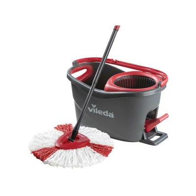 ManoManoGeneral description The Vileda Turbo Spin Mop and Bucket Kit VIL155675 is designed for effortless cleaning with its foot pedal operated SPIN wringer, allowing you to wring out the mop without bending or pushing down. The mop features a triangular-shaped head for effective corner cleaning and a microfibre mop head that removes over 99% of bacteria using just water, making it an eco-friendly choice. The mop head is machine washable, ensuring long-lasting use. Technical specifications MPN: VIL155675 EAN: 4023103194113 Telescopic handle extends from 55cm to 130cm Type: Mop & Bucket Compatibility and accessories Suitable for use on tiles, vinyl, wood, and laminate floors Includes 1 x Vileda Turbo Spin Mop & Bucket Usage Designed for easy cleaning of various floor types Effective in removing E. coli and S. aureus from hardwood floors and ceramic tiles Other information