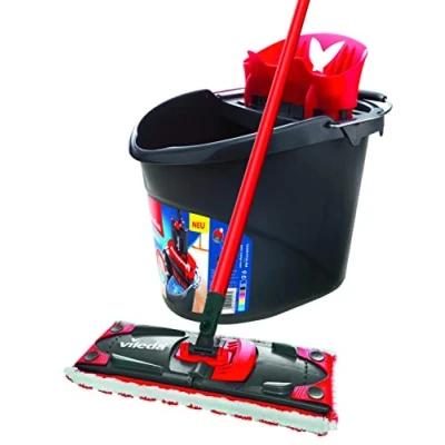 The Vileda UltraMat 2-in-1 complete set with UltraMat flat wiper with three-piece handle, 2-in-1 microfibre mop cover and UltraMat bucket with PowerPress Reaches all corners and edges and thoroughly removes even strong dirt and stubborn stains thanks to the reinforced Power Zone Thanks to its 3D structure and power fibres, the microfibre cover glides smoothly over the floor and leaves shiny and streak-free cleaning results In the UltraMat bucket with PowerPress, the mop cover can be easily washed, wrung out and the moisture level of the cover optimally adjusted - the back is protected and your hands stay dry Removes over 99 percent of bacteria only with water - confirmed by an independent, accredited institute of microbiology and immunology Power source type: hand-operated