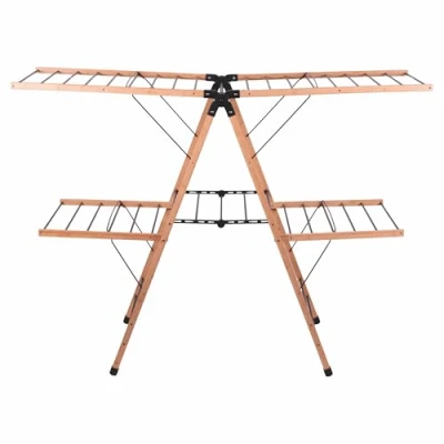 Drying rack made of bamboo and powder-coated iron Plastic inserts (PP) Drying space: 26 m 2 lower shelves collapsible lower shelves Height of shelves: h. 23" Modern Design Bamboo frame thickness: 25 x 20 mm Wrinkle resistant threads: diameter 4.5 mm Fully collapsible and space-saving, non-slip inserts. Open airer measures: L. 155 x 62 x H 114 cm. Dimensions airer close l. 62 x D 63 x H 118 cm Colour: black and natural wood