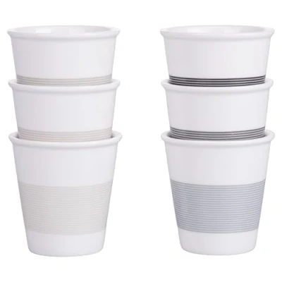 Set of 6 Daily Stones coffee cups in porcelain. Glossy finish. Capacity: 60 ml. Dimensions: Ø 5.8 x h. 6 cm Dishwasher safe Microwave safe Colour: white base and stripes in the shade of grey Daily Stones Set of 6 Porcelain Coffee Cups Gloss finish; Capacity: 60ml Dimensions: Ø 5.8 x h. 6 cm; Dishwasher safe Microwave-safe; Colour: white background and stripes in grey gradient