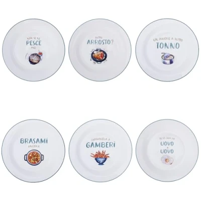 Le Travisate dinner plate; New bone china Dimensions: Ø 27 x H 2.2 cm ; Available in 6 assortments: No more fishing; All ROAST? ; A love to all TUNA; BRASME again; Let's give it to SHRIMP; I tell you from EGG to EGG Dishwasher safe; Microwave safe Colour: white background, aquamarine border, lettering and drawings of second courses