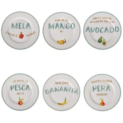 Le Travisate fruit plate; New bone china Dimensions: Ø 19 x H 1.5 cm ; Available in 6 assortments: apple singing and apple sound; I do not know MANGO I; I speak only in the presence of my AVOCADO; I lost the PEACH for you; Don't say BANANITA ; Too good, PEAR misery! Dishwasher safe; Microwave safe Color: white background, aquamarine border, fruit lettering and drawings;