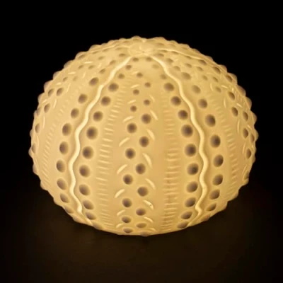 Decorative sea urchin Ocean Ceramic matt finish With LED On/off switch Works with 3 LR44 batteries (not included) Polycarbonate battery compartment cover. Dimensions: L. 10.4 x 10.4 x H 6.8 cm. Colour: white Decorative Ocean Sea Urchin; Ceramic Matt finish; With LED On/off switch; Works with 3 x LR44 batteries (not included) Battery compartment cover made of polycarbonate; Dimensions: L. 10.4 x 10.4 x H 6.8 cm