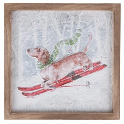 XMas Vintage Christmas Picture Frame in Paulownia Wood Paper Canvas Equipped with Iron Hook Snowy Landscape Dachshund on Ski with Scarf Vintage Style Measurements: L 25 x D 2 x H 25 cm. Frame colour: natural wood. Ideal for decorating bedrooms and/or living rooms XMas Vintage Christmas Picture, Paulownia Wooden Frame Paper canvas; Iron hook Snowy landscape; Dachshund on ski with scarf Vintage style; Size: L 25 x D 2 x H 25 cm