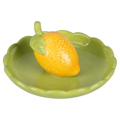 Fruit Life decorative round saucer in ceramic design lemon Dimensions: Ø 11.2 x h. 5 cm. Not suitable for direct contact with food. Colour: green and yellow Fruit Life Decorative Round Ceramic Saucer Lemon design. Dimensions: Ø 11.2 x h. 5 cm Not suitable for direct contact with food; Colour: green and yellow
