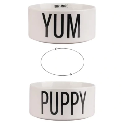 Bigismore Small Stoneware Pet Bowl Exterior matt finish and internal gloss; Decoration with lettering Dimensions: diameter 13.8 x h. 6.5cm; Capacity 600ml Dishwasher safe; Ideal as a treat bowl or water bowl Colour: ivory