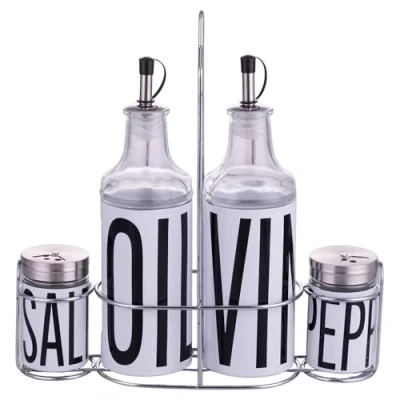Bigismore Oil, Vinegar, Salt and Pepper Seasoning Set; Glass and Stainless Steel; Oil and Vinegar Dispenser with PP Plastic Drip Stopper and Silicone Seal Stainless steel salt and pepper shakers with holes of different sizes. Stand in carbon steel (Q195). The seasoning set consists of: Oil jar, vinegar, salt and pepper dose; Decoration with Bigismore lettering; Glossy finish Oil and vinegar dispenser measures: Ø 4.5 x h. 19 cm (350 ml capacity); salt and pepper dosage measurements: Ø 4.5 x h. 8.5cm (capacity 90ml); Hand wash Color: clear and white with black lettering; ;