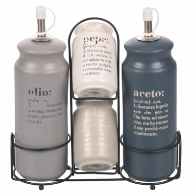 Victionary Stoneware Seasoning Set (Stoneware) Stand in stainless steel 204 Oil and vinegar with 201 stainless steel spout and plastic drip stopper (PP). The seasoning set consists of: oil jar, vinegar, salt and pepper dosage Decoration with Victionary definition of "oil", "vinegar", "salt, pepper" Victionary Stoneware Seasoning Set Stand dimensions: L19.8 x D7.2 x H 19.5 cm 204 stainless steel stand. Hand wash; Oil and vinegar dispenser with 201 stainless steel spout and drip stopper made of plastic (PP) The seasoning set consists of: oil, vinegar, salt and pepper dose; decoration with Victionary definition of "oil", "vinegar", "salt, pepper" Matte finish; Oil and vinegar capacity: 320ml